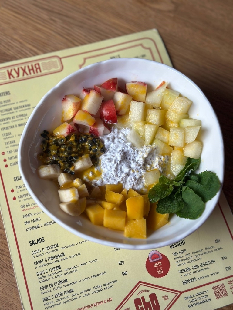 манго, банан, ананас, питахайя, маракуйя,сливочный крем с семенами чиа, мята