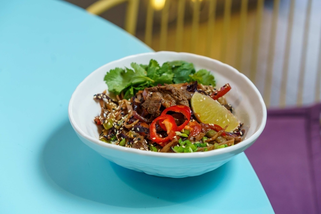 с говядиной, грибами, овощами, перцом чили, кинзой, семенами кунжута и лаймом