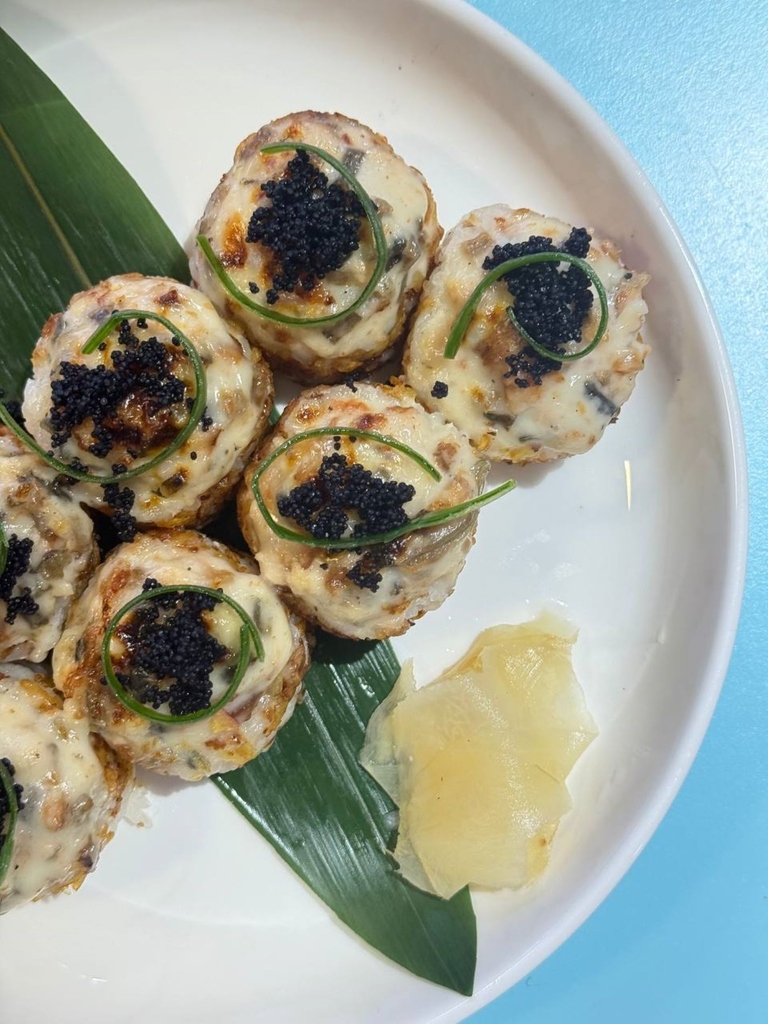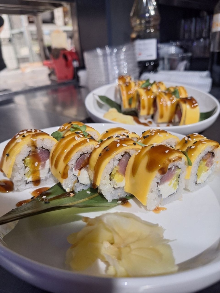 тунец, краб спайси, сыр сливочный, огурцы свежие, чука, лук зеленый, такуан, соус унаги, кунжут