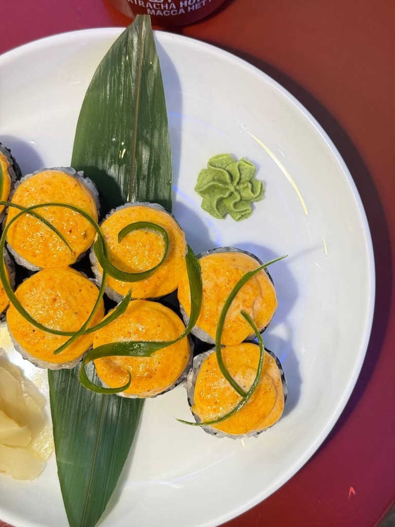 лосось, краб спайси, сыр сливочный, огурцы свежие, чука, лук зеленый, соус спайси, соус манго, кунжут