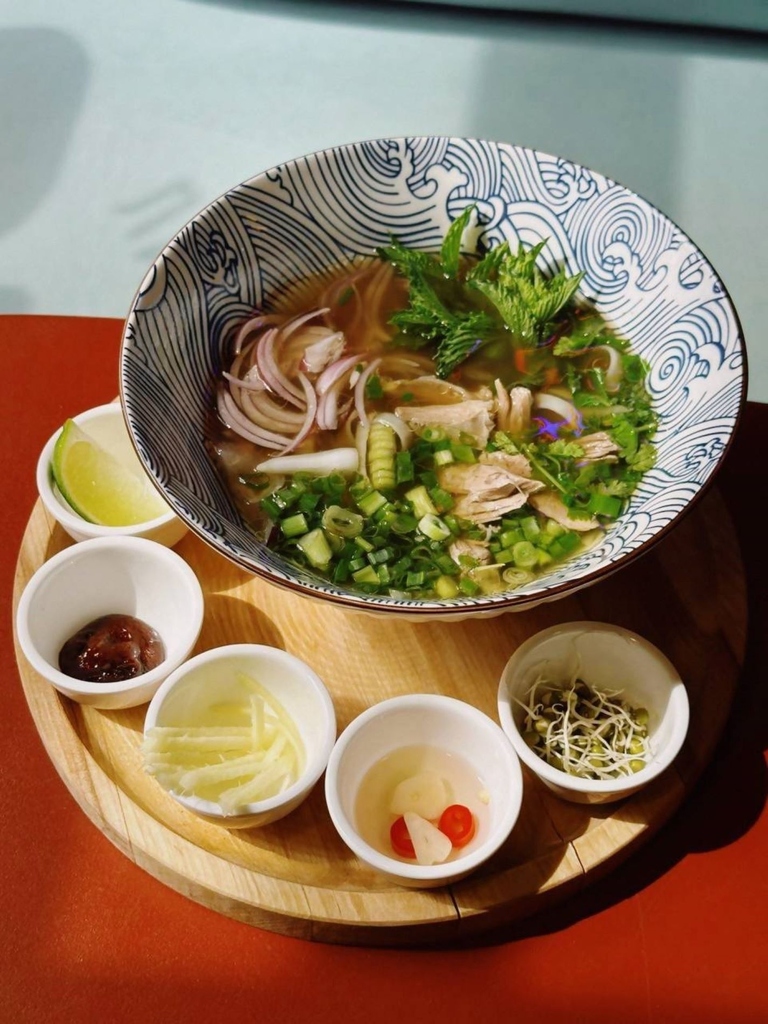 бульон говяжий, паста кочудян, говядина, лапша рисовая, ростки маш, кинза, лук красный, лук зеленый, мята, перец чили, корень имбиря, чеснок, лайм